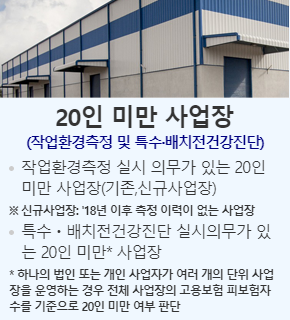 - 지원대상: 산재보상보험법에 가입한 사업장 중 고용보험 피보험자 수 조회 결과 20인 미만 사업장 (작업환경측정 대상 유해인자 보유 사업장)